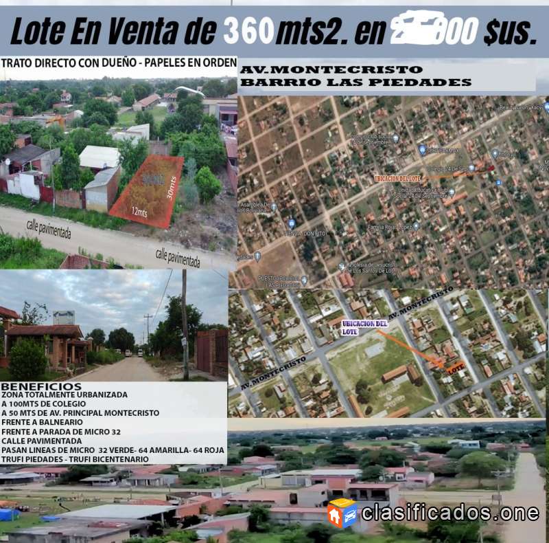 Lote de 360m2, sobre calle pavimentada, entra micro 32 verde 64 amarilla 64 roja trufi bicentenario, trufi piedades
